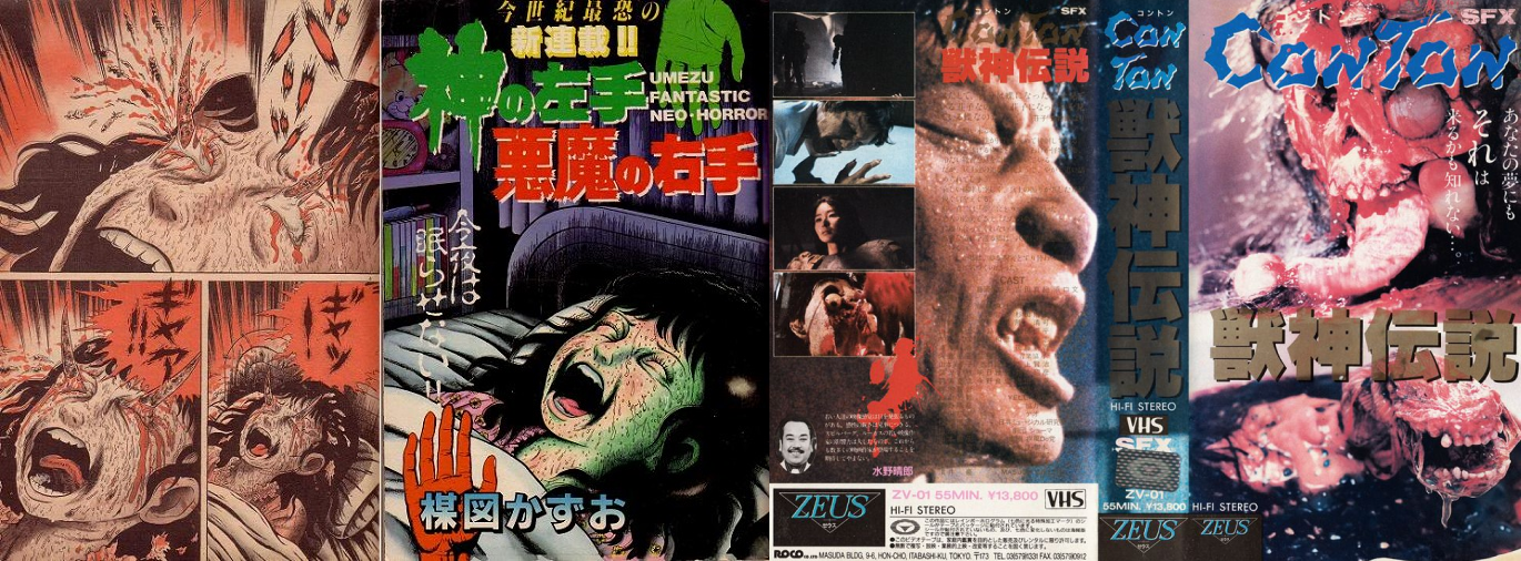 Left: Manga scans of works by Kazuo Umezu. Right: VHS sleeve for the film Conton(1987) by Takuro Fukuda.