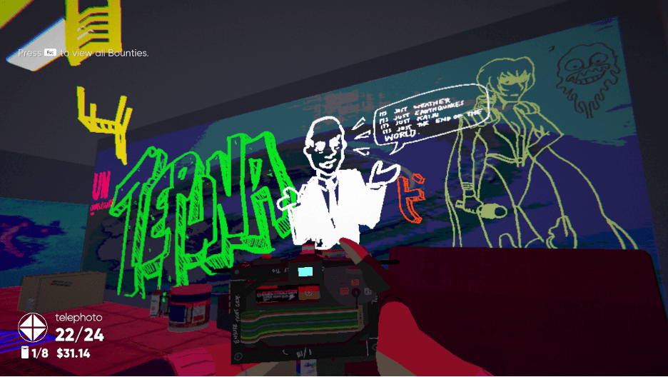 In an interview with The Indie Game Website, main developer Naphtali “Veselekov” Faulkner spoke to this theme of helplessness as inspired by the state of the world in 2020: particularly in the face of the Australian government’s handling of its bush fires and COVID-19 crises. Something that struck me in reading this interview was the idea of normalization. Government attitudes and propaganda take crises and force complacency by adopting the rhetoric of “the new normal.” This message is spray painted all over the game: from the blue bottles (that one is forbidden from acknowledging) to the caricature of a politician saying, “ITS JUST WEATHER/ITS JUST EARTHQUAKES/ITS JUST KAIJU/ITS JUST THE END OF THE WORLD.” As the photographer forced to bear witness to the active ending of the world, the player can only progress if they accept this “new normal” and complete the objectives. The mechanical inability to interact with the plot of Umurangi Generation is thus an intentional critique of neoliberal inertia.